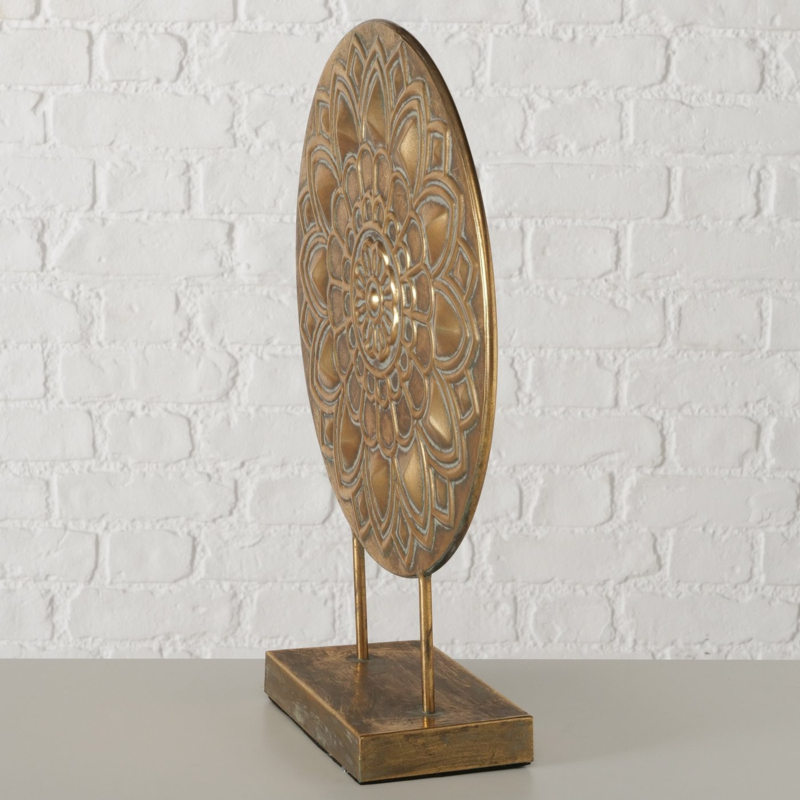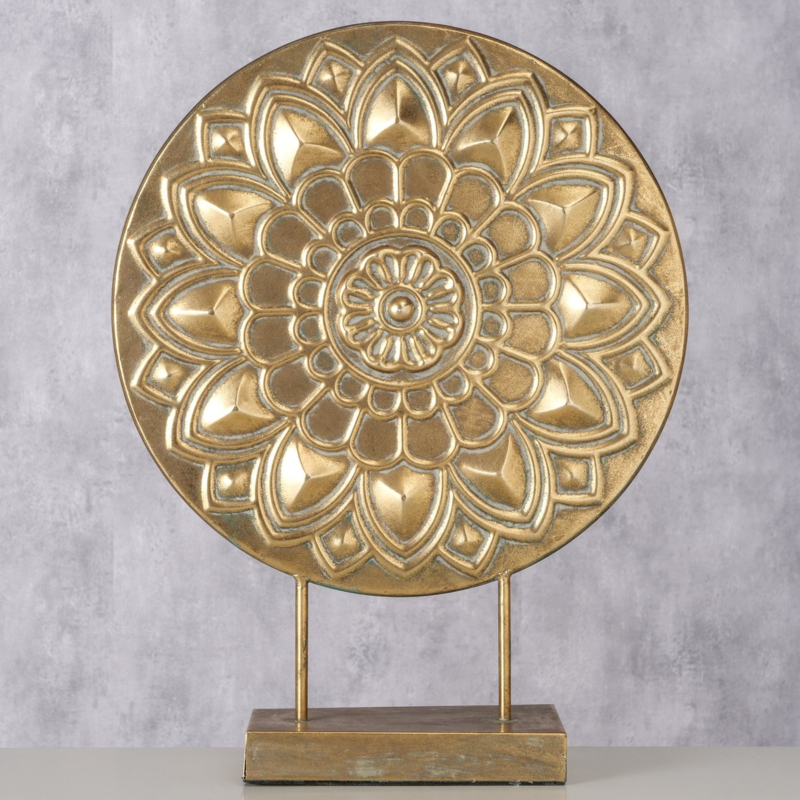 Artikelnummer: 4066076684472 OverzichtDe decoratieve standaard Alhambra is vervaardigd uit ijzer en heeft een rond, geometrisch ontwerp met een antieke goudkleurige afwerking en een matte finish.