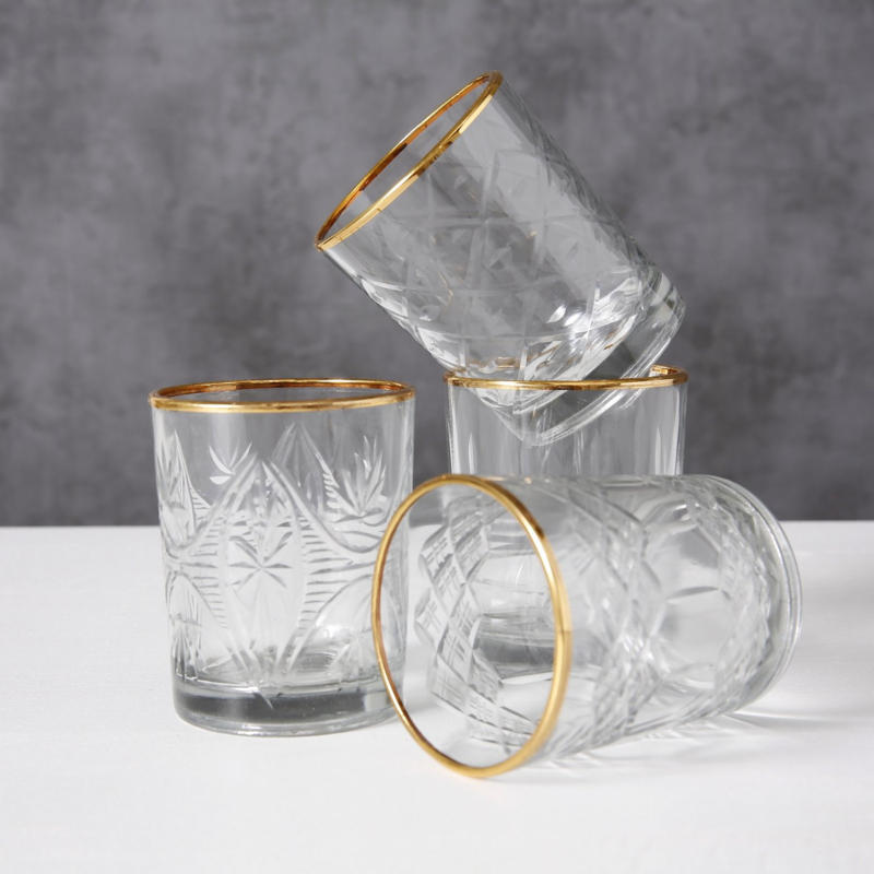 Whiskey glazen - Drink glazen - 24cl - Glas - Boltze - 4 set - Goud randje .Drink glas 4 verschillende patronen, dus altijd je eigen glas.